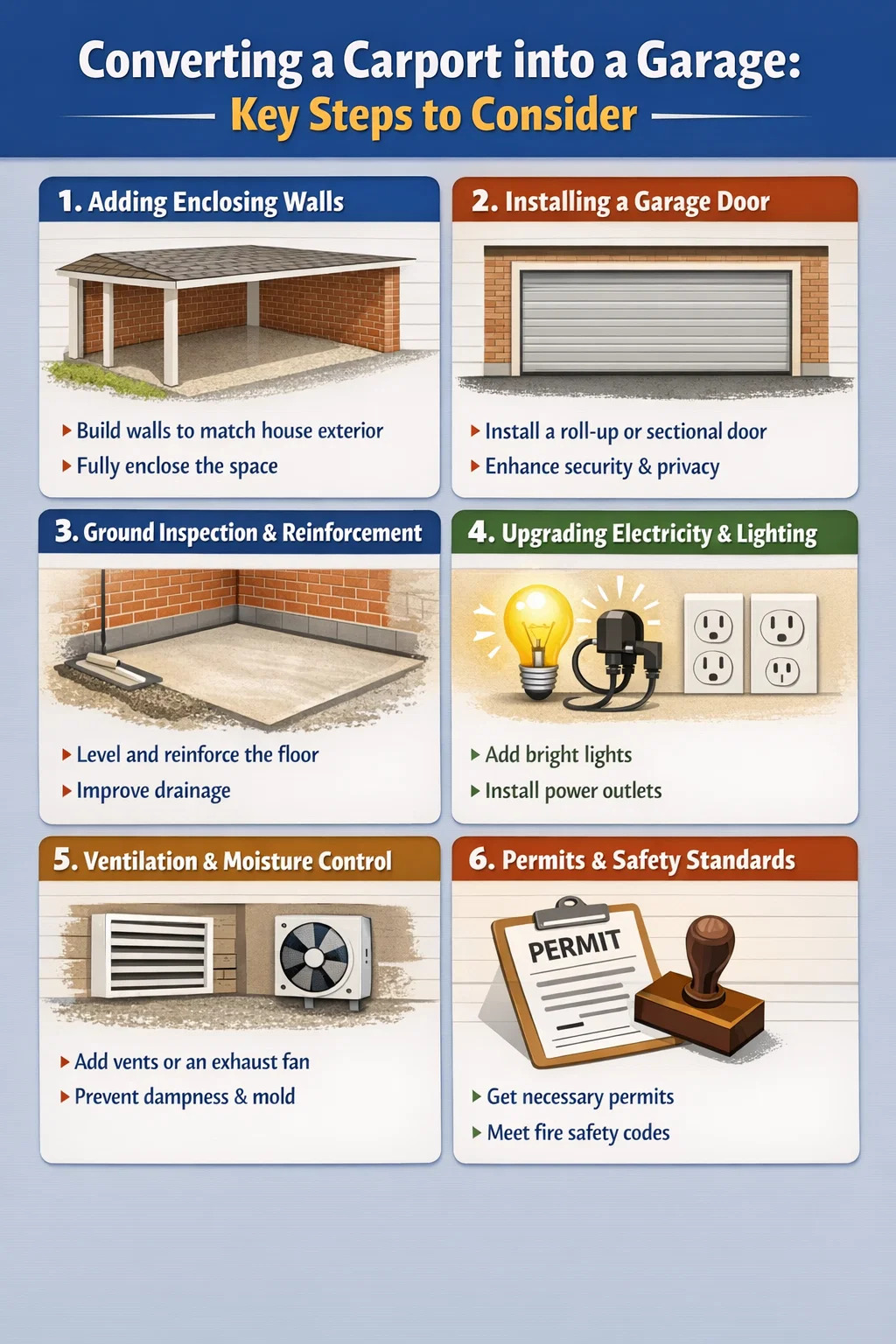 を変換する カーポート ガレージへの改造は、多くの住宅所有者が家のセキュリティと収納スペースを増やすために検討する一般的な改修プロジェクトです。簡単に言えば、このプロセスは「屋外シェルター」を「密室」に変えます。