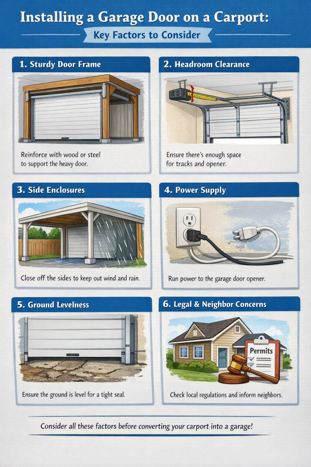答えは「はい」ですが、ドアを買って吊るすだけというほど単純ではありません。カーポートにガレージドアを取り付けることは、実際には、カーポートを適切なガレージに変えるための最初のステップです。