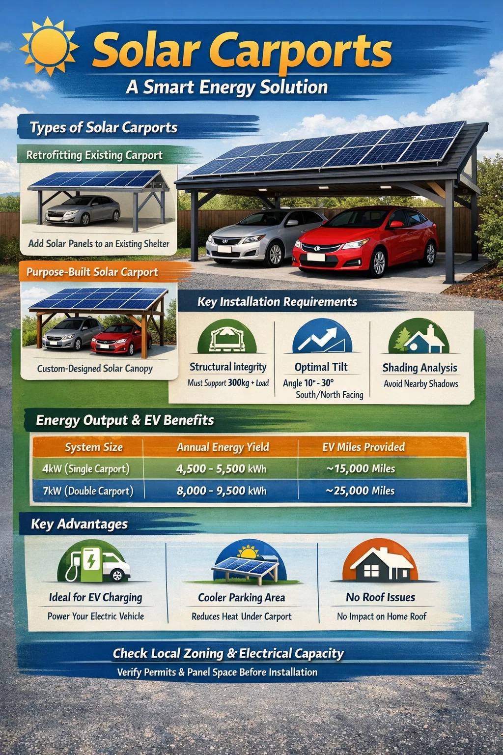 - シェーディング分析: カーポートは母屋よりも低いことが多いため、近くの木や本邸の影が母屋に影を落とさないようにする必要があります。 カーポート 、出力が大幅に低下します。