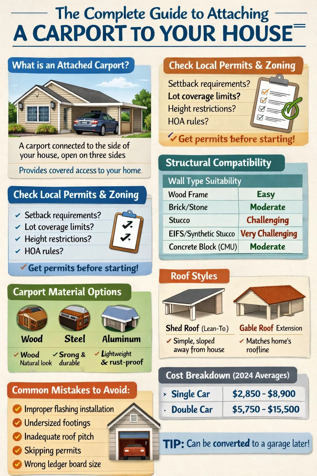 はい、家にカーポートを取り付けることができます。そしてほとんどの場合、それは完全なガレージを建てるよりも実用的でコスト効率の高い代替手段です。 付属のカーポートの費用は通常 3,000 ドルから 10,000 ドルの間です 、新しい付属ガレージの場合は20,000〜50,000ドルと比較します。ただし、家にカーポートを取り付ける必要があるかどうかは、地域のゾーニング法、家の外壁の構造的適合性、敷地のレイアウト、および使用する予定の材料によって異なります。このガイドでは、カーポート取り付けプロジェクトを開始する前に知っておく必要があるすべてのことを説明します。
