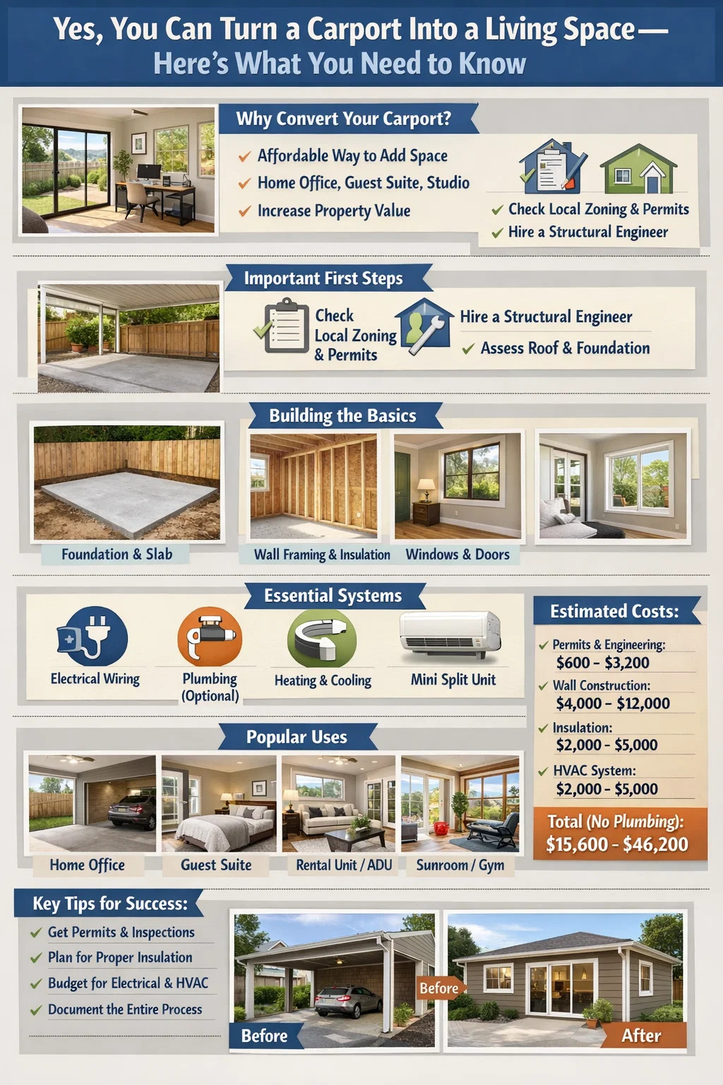 とはいえ、カーポートをリビングスペースに変えるのは、ドアを追加して部屋と呼ぶほど簡単ではありません。ゾーニング法、建築基準法、構造要件、断熱の問題、予算に関する考慮事項がすべて関係します。この記事では、プロセスの主要な側面をすべて説明するので、明確な期待としっかりした計画を持って作業に取り組むことができます。