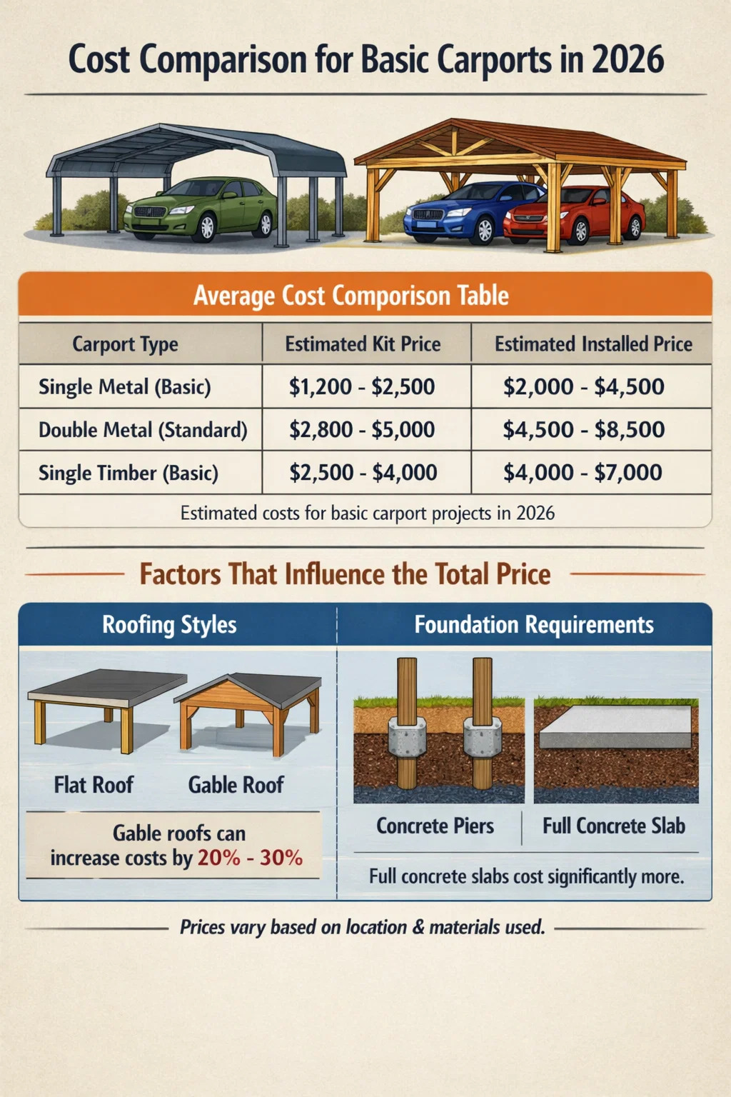 次の表は、カーポート構造のサイズとタイプに基づく推定コストの明確な比較を示しています。