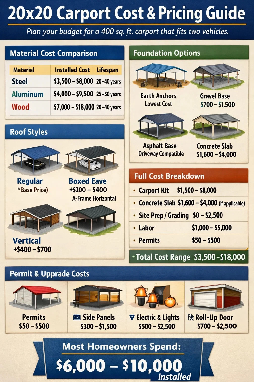 20x20 のカーポートの設置には総額 3,500 ドルから 18,000 ドルの費用がかかり、ほとんどの住宅所有者は約 6,000 ドルから 10,000 ドルを費やします。 プロが設置した2台用カーポート用。この幅広い範囲には、材料の種類 (木材、スチール、アルミニウム)、プレハブキットかカスタムビルドのどちらを選択するか、現地の労働料金、現場準備の必要性、許可料などの違いが反映されています。平地に設置できる基本的なスチール製カーポートの設置費用は、安価なものであれば 4,000 ドル未満ですが、こけら葺き屋根とコンクリート スラブを備えた特注の木製カーポートの場合は、15,000 ドルをはるかに超える場合もあります。このガイドでは、あらゆるコスト要因を分析して、20x20 のカーポートの予算を正確に計画できるようにします。