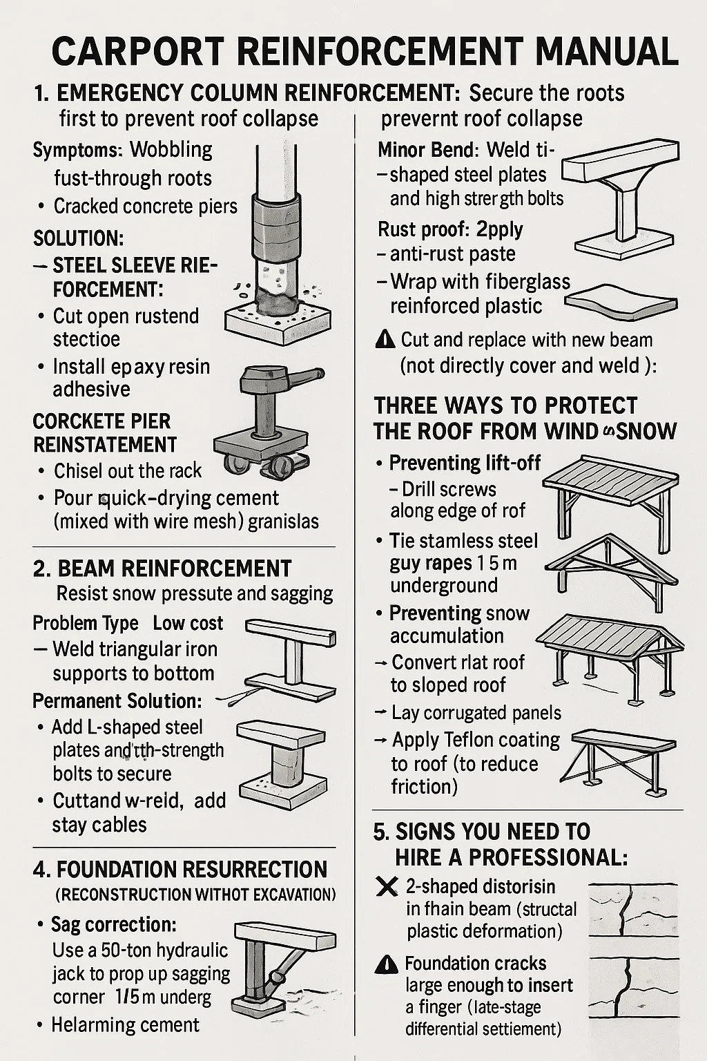 解決策: → スチールスリーブ補強: 錆びた部分を切り開きます → 内径を合わせた亜鉛メッキ鋼管を設置します → エポキシ樹脂接着剤を塗布します → コンクリート橋脚の修復: ひび割れを彫刻刀で削ります → 鉄筋を挿入します → 速乾性セメント(金網と混合)を流し込みます → 従来の工法: トラックジャッキを使用して梁を支えます → 底部に花崗岩のスラブを詰めます