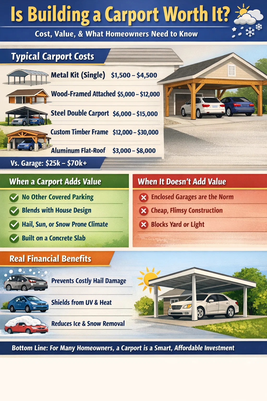 これを、車 1 台分の独立したガレージと比較してください。 25,000ドルから50,000ドル 米国のほとんどの市場ではそれ以上です。適切なフレーム、断熱材、乾式壁、ドアを備えた付属のガレージは、より高価な州では 40,000 ドルから 70,000 ドルを押し上げる可能性があります。カーポートは、ガレージのコストのおよそ 15% ~ 30% で、太陽、雨、雹、鳥の糞から身を守るという核となる利点を提供します。