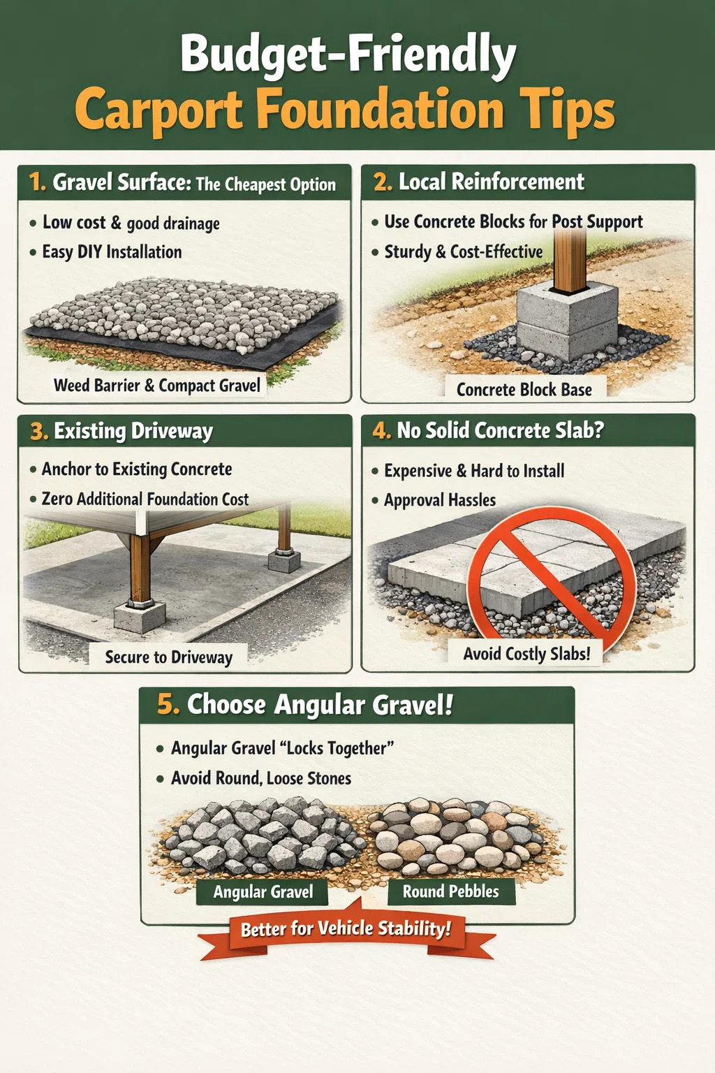 原則: これは、エリア全体に「大きな基礎」を作成する必要がなく、支柱に「足」を与えるのと同じです。これにより、強風下でもカーポートが安定した状態を保ちながら、材料費を大幅に節約できます。