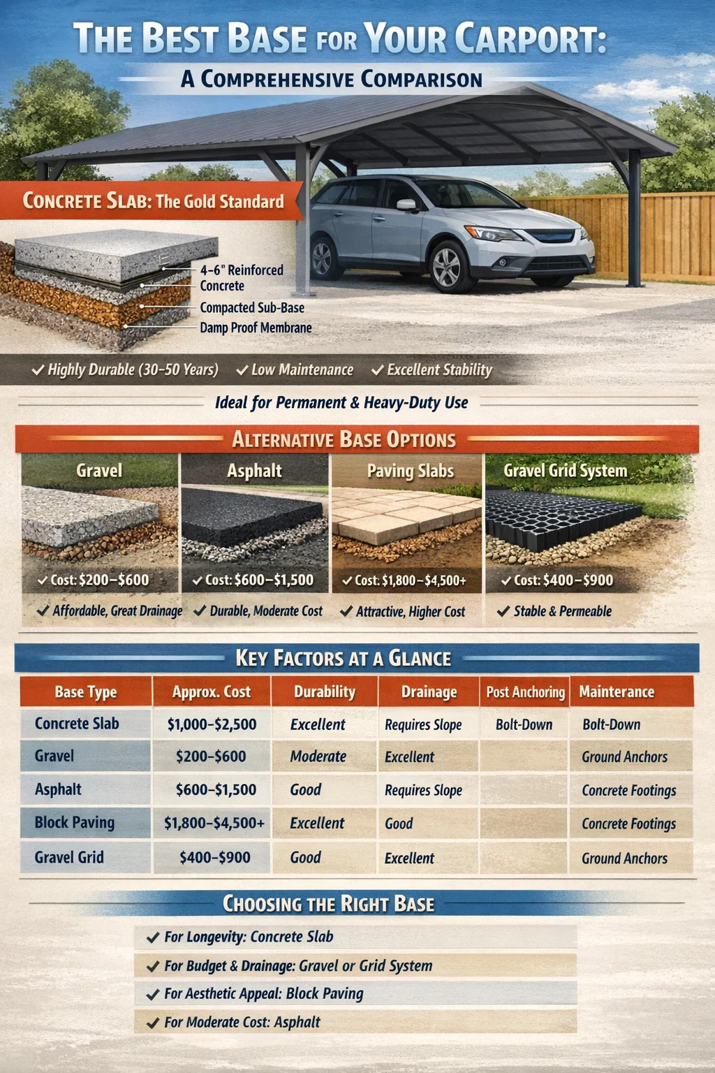 直接の答えが必要な場合: 鉄筋コンクリート スラブは、ほとんどの状況でカーポートの基礎として最適です。 比類のない安定性、長寿命、耐荷重能力を提供します。適切に注入されたコンクリート スラブ (標準的なカーポートの場合は通常 4 インチの厚さ、大型トラックや SUV を駐車する場合は 6 インチの厚さ) は、カーポートの構造自体よりも長持ちし、一度硬化するとメンテナンスはほとんど必要ありません。とはいえ、コンクリートが常に適切な選択であるとは限りません。砂利、アスファルト、舗装スラブ、圧縮されたハードコアはすべて、予算、土壌の種類、排水要件、カーポートが一時的か永続的かに応じて、正当な使用例があります。